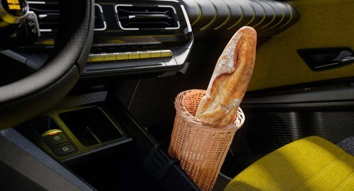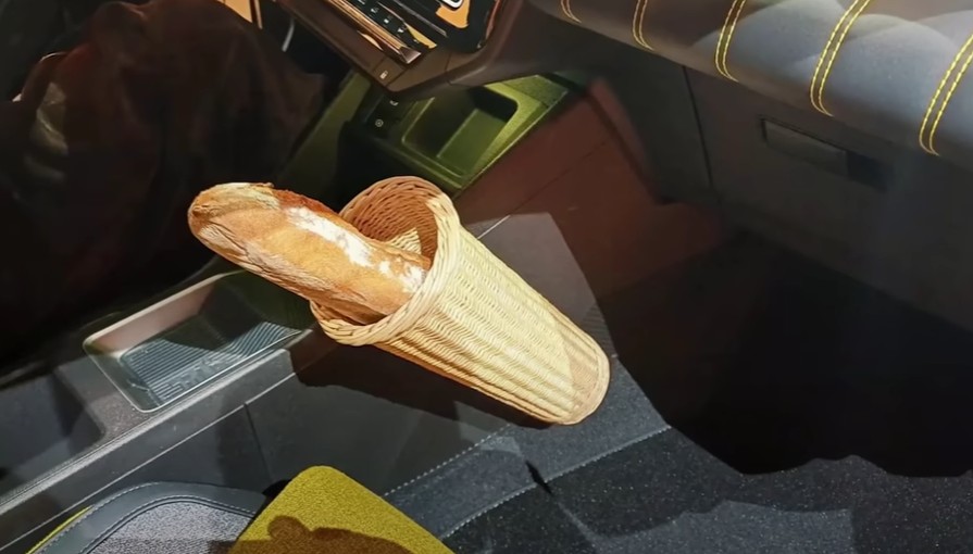籐(ラタン)の細長いバスケットをセンターコンソールに取り付けできる、というユーモアあふれるアイディア。世界初のバゲットホルダーを搭載した車として注目を集めています。