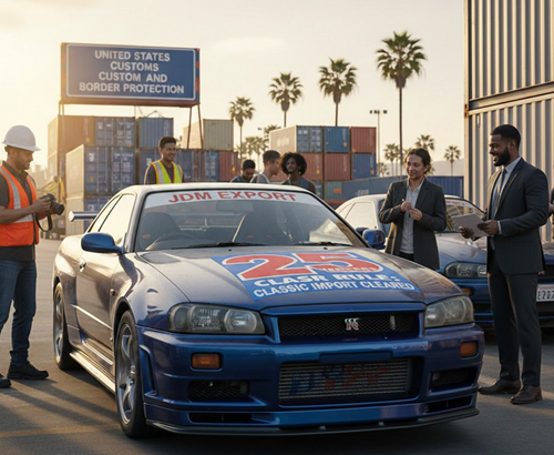 正式にはアメリカ連邦法に基づく輸入車両規制の例外規定で、製造から25年以上経過した車両は、安全基準(FMVSS)を免除される。